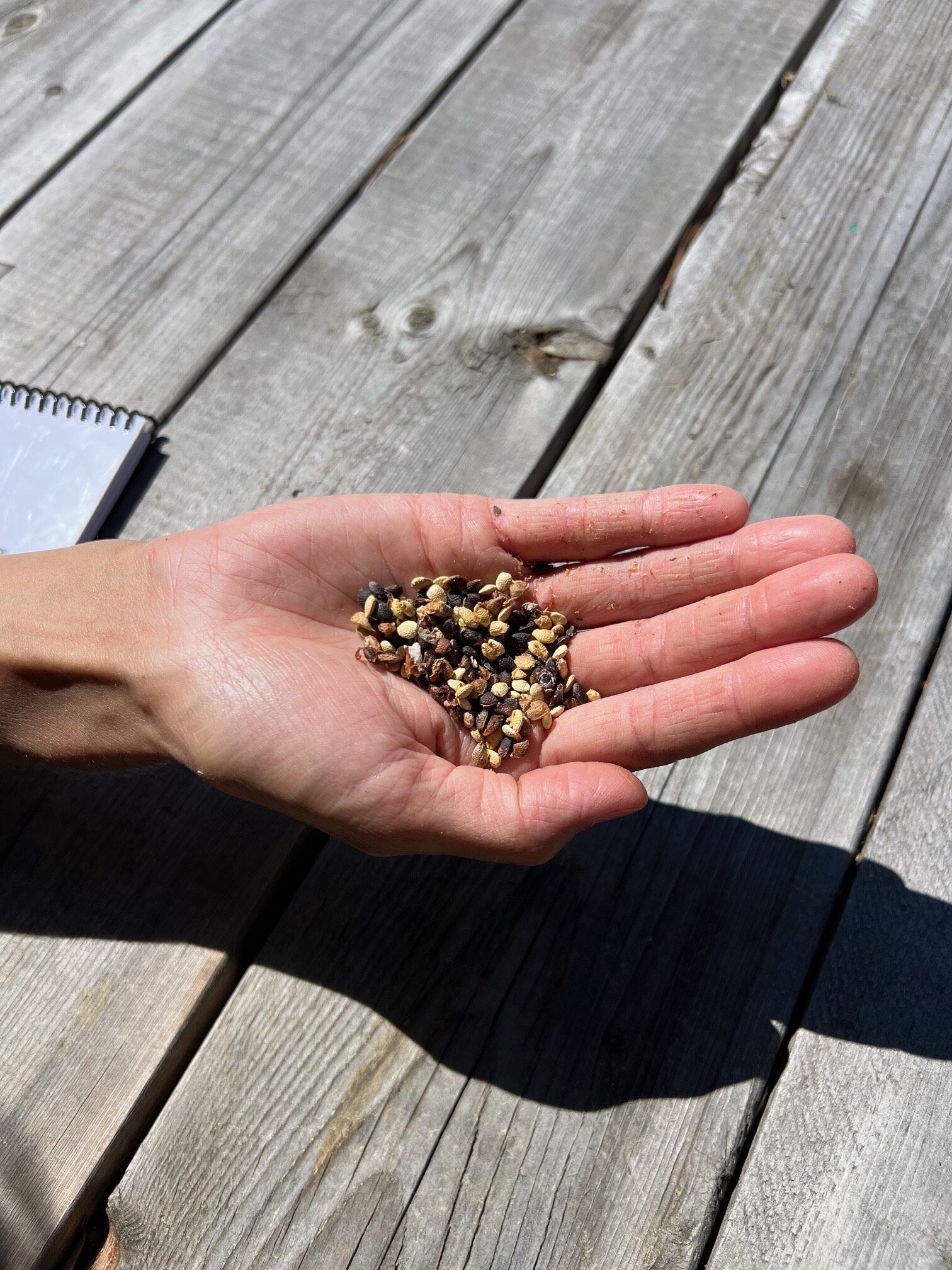 You heard that right. Those very seeds Cassy collected and harvested by hand across our region have grown up right here at Stowe. When I first saw their operation at the start of this summer, I couldn’t help but smile at the sight of seedlings with so much potential. They’ve been propagated on-site in reused nursery trays, sheltered beneath a homemade hoop house constructed from salvaged netting once used in the Butterfly Bungalow.