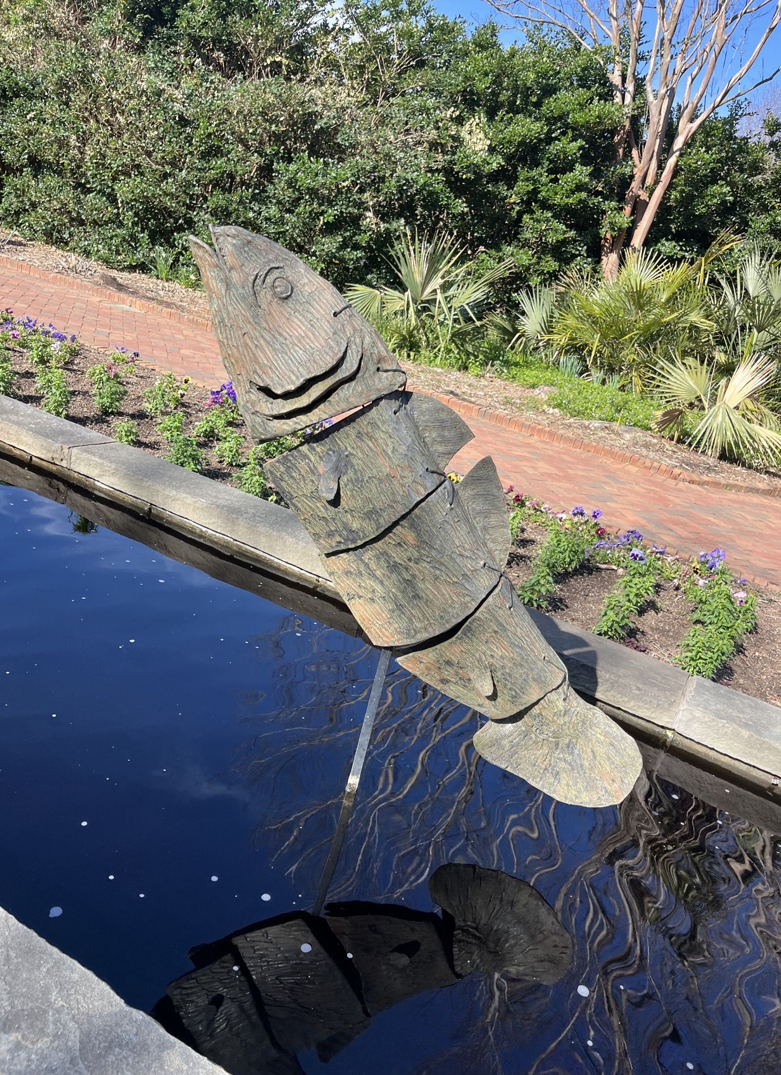 Just beyond Crape Myrtle Crossing, you’ll find the iconic Canal Garden, which is the focal point of many Garden photoshoots. If you’ve visited Stowe in the past, you’ve probably noticed the 10 fish sculptures leaping playfully down the length of the Canal Garden Fountain. They were originally installed as a temporary exhibit for the Canal Garden back in 2000. Garden visitors and board members liked them so much that they were purchased to be a permanent addition to the Garden.