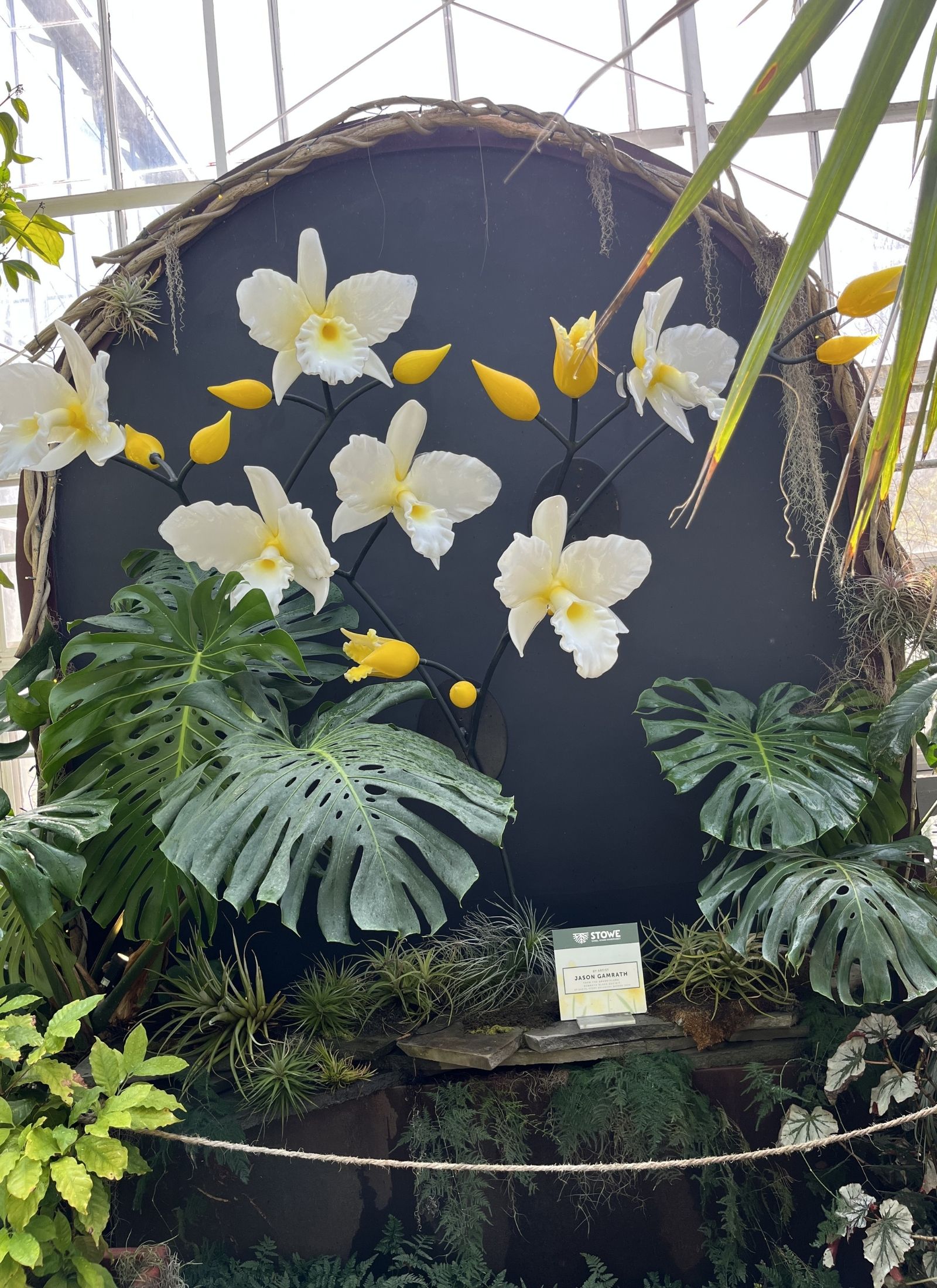 Keep walking through the Conservatory and you’ll find yourself surrounded by several air plant archways. Just beyond these archways is the new home of Glass Daffodils by Jason Gamrath. If you’ve visited Stowe in the last few years, you may have spotted these daffodils inside the Garden Pavilion lobby, but we recently moved them to the Conservatory because that spot felt like the perfect fit for these larger-than-life flowers. Gamrath is a glass artist from Seattle, Washington that creates life size botanicals. Gamrath’s purpose with this daffodil piece was to take something small and “overwhelmingly perplexing” and capture the viewers’ interest and curiosity. While it is easy to overlook the natural beauty on a microscopic scale, Gamrath hopes that by recreating a plant on a macro scale, it lets them “observe with the same eyes through which ‘he’ humbly and graciously experiences our natural world”. Gamrath exhibited his work at Stowe in June of 2019 and this sculpture is a piece from that collection.