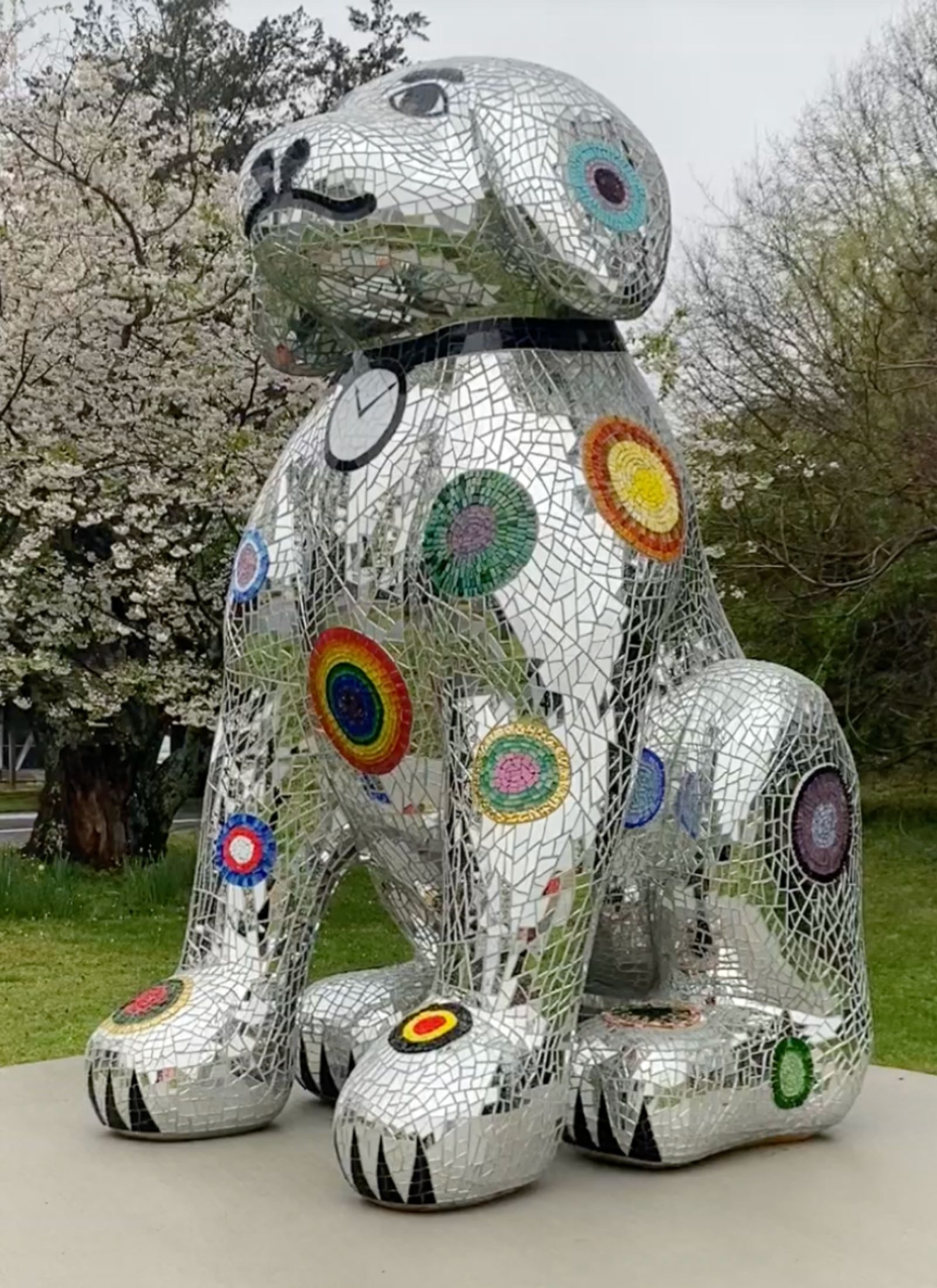 Spot the Disco Dog greets you as you enter The Village at Stowe and absolutely cannot be missed with his shiny reflective surface and gigantic puppy dog eyes.. This unforgettable piece is by Elizabeth Healey, an established artist from California, is known for her gigantic “disco” style large sculptures. This one, a watchdog known as Spot, sits at an impressive 8′ tall outside the Dog Park here at Stowe. Healey expressed with this work that ever since the pandemic in 2020, she has wanted to bring cheer and hope with her sculptures. He has become a notable feature when approaching Stowe, welcoming guests at the Village entrance with a smile.