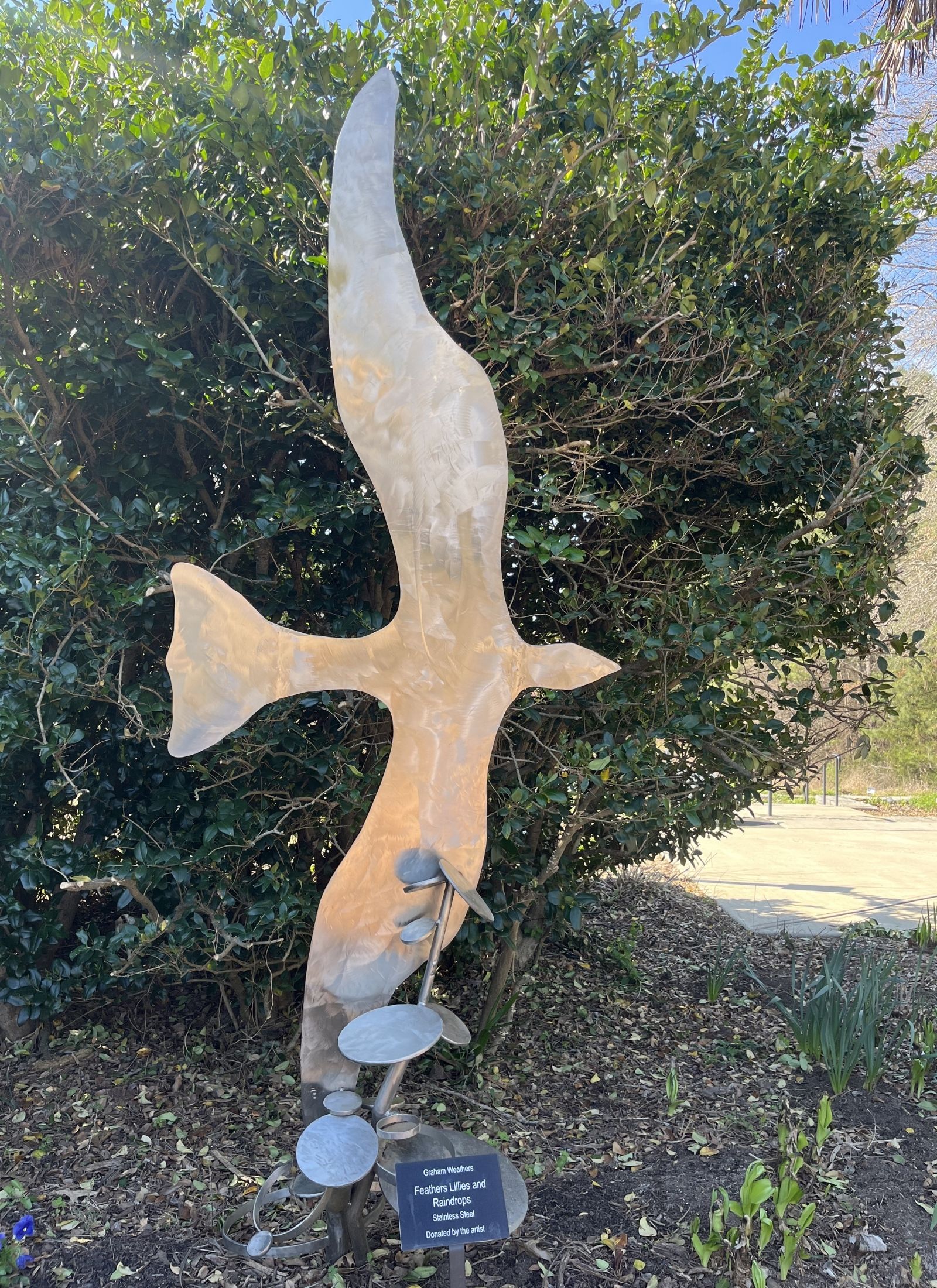 You won’t have to go far past the fish to find the next sculpture on our list. Just beyond the fountain at the very end of the Canal Garden, you’ll discover Feathers Lillies and Raindrops, a sculpture of a large, stainless steel bird with abstract nature elements in front of it. A very different look and material than his piece Laura near the White Garden, this piece showcases Weathers in a whole new light. Weathers was better known for his work in bronze, but this shows his ability to explore different mediums and still be successful. Weathers has won multiple awards and his works are featured in numerous public and private collections. He even has a casting on board the USS Charlotte nuclear submarine and in the Mirow Castle in Germany.