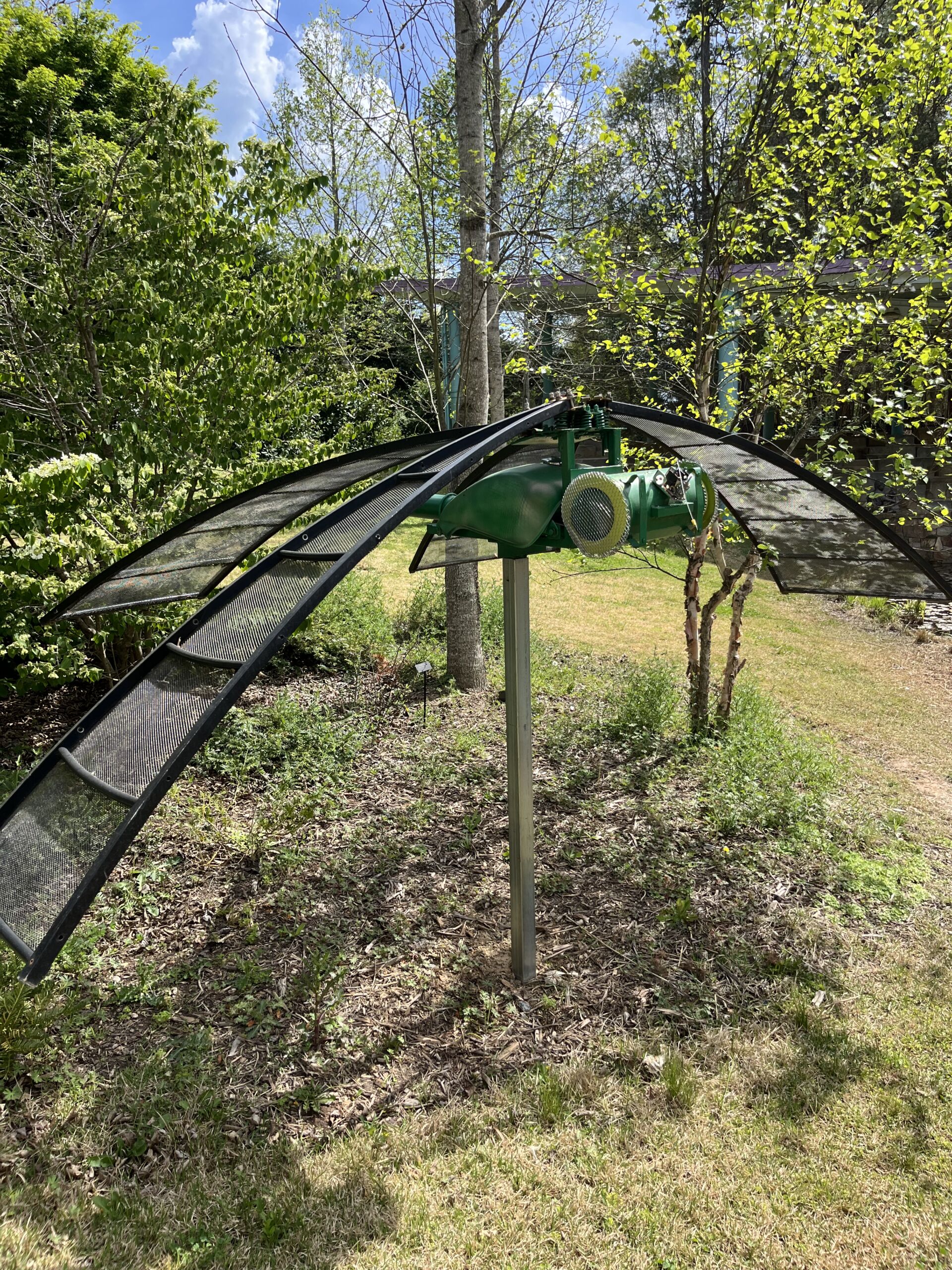 Dragonfly II is a sculptural work constructed from reclaimed scrap metal. Its body is formed from a motorcycle gas tank, the head from an air tank, and the eyes from salvaged trim rings of eyeball lights. The tail is made from a car spring, and the wings are cut from sections of an early satellite dish. This piece follows Dragonfly I, which shared a similar design but ultimately deteriorated due to structural weaknesses. In Dragonfly II, those flaws have been resolved, resulting in a more durable form intended to better withstand the elements.