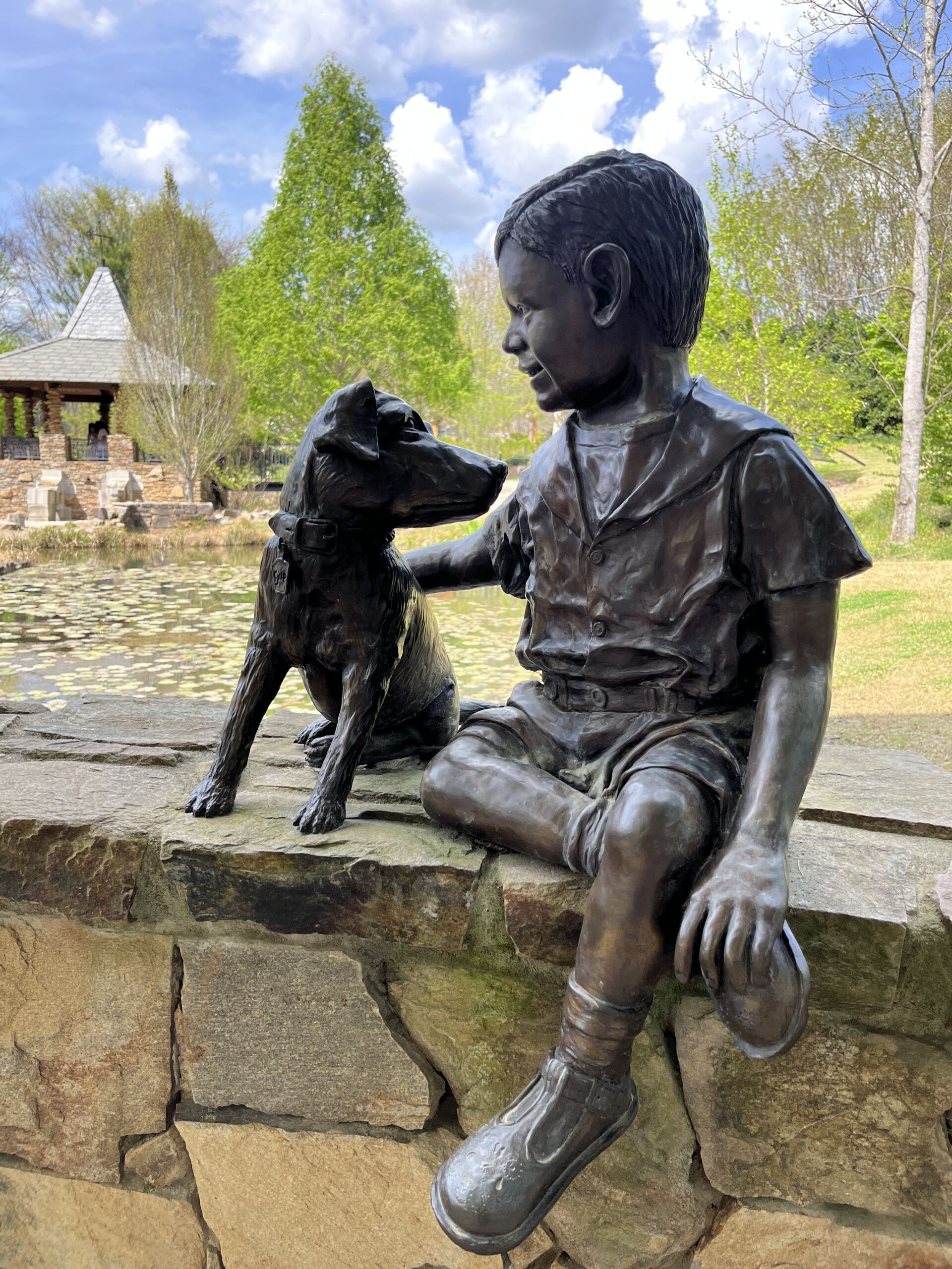 On the other side of the pond tucked on a ledge in the Sunken Pond Amphitheater is The Boy and Dog statue. This statue holds strong sentimental significance to The Gardens’ history, as it depicts Robert Ragan, one of Stowe’s board members, biggest supporters and benefactors (The Ragan Canal Garden is named after him!) with his childhood dog, Snip, a Fox Terrier. The statue is dedicated to Snip’s memory, since he saved Robert’s life when he was just 18 months old!