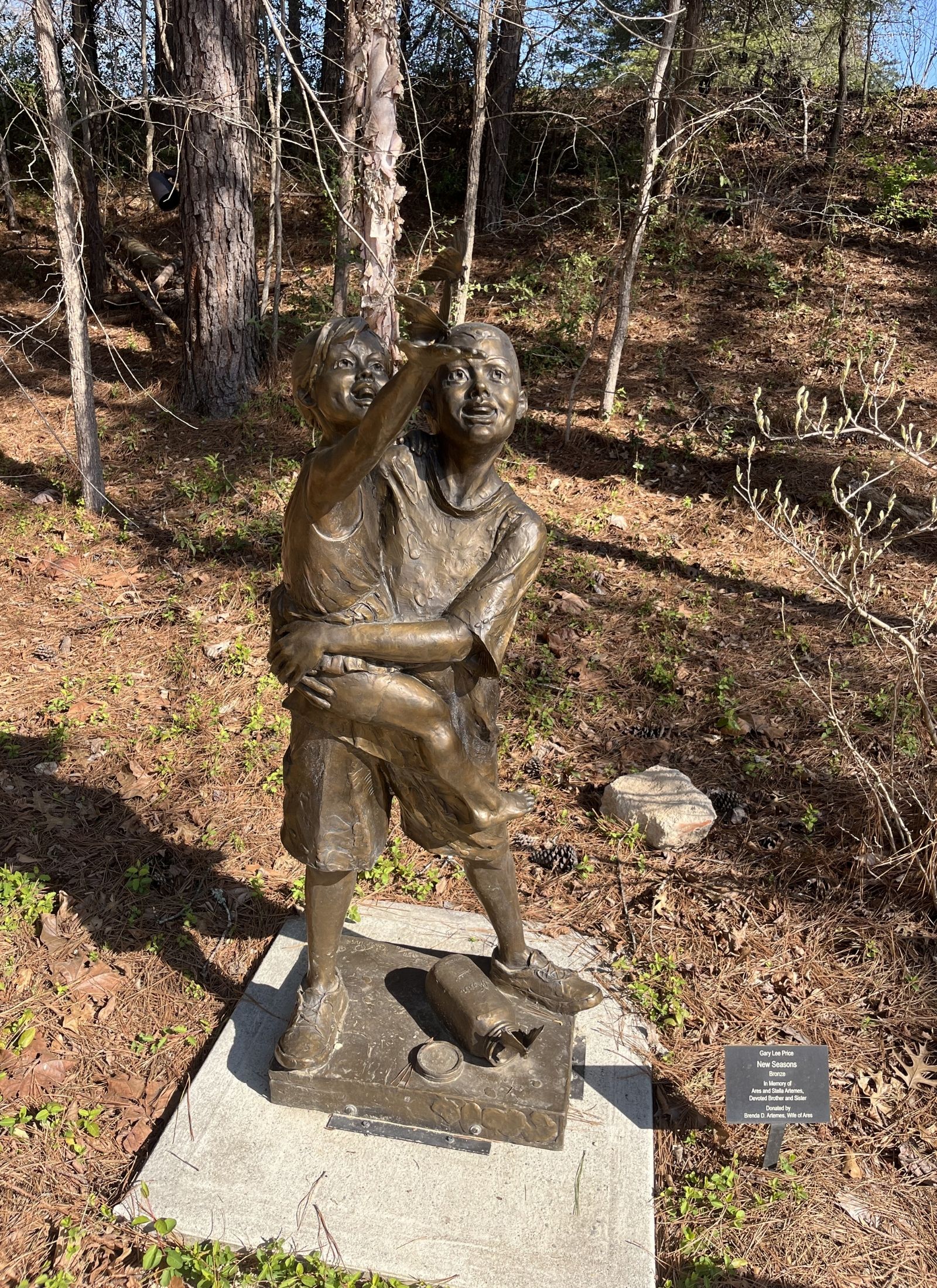 You might have to hunt a little bit for the final Lost Hollow art piece. New Seasons is located down the steps deep within the Lost Hollow garden along the right side path. This sweet statue is all about renewal, rebirth and the metamorphosis of change, depicting a boy holding his younger sister as they gaze up in wonder at butterflies she releases from her hand. Price shows a special kind of tenderness and care between the siblings, while also showing a child’s natural inquisitiveness, making this statue the perfect addition to our children’s garden. Fun fact: the boy was modeled by the artist’s own son!