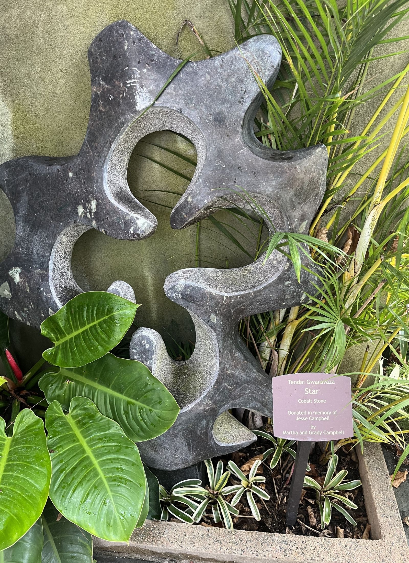 Star greets you as soon as you enter the Conservatory. This piece by Tendai Gwaravaza, a generational Zimsculpt artist. He was raised by his grandmother, a potter, and surrounded by his uncles, who carved wooden instruments. His father taught him the art of stone sculpting. Gwaravaza has been sculpting for fourteen years now, creating sculptures inspired by the sacred beliefs of the Shona people. This piece was donated to the garden in memory of Jesse Campbell by Martha and Grady Campbell.