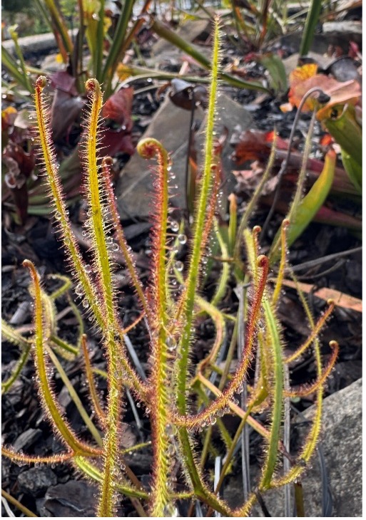Drosera: Sundews have a completely different type of trap for catching insects. They have thin leaves covered in hairs with a glad on the top. The glad produces a sweet sticky goo that both attracts insects and traps them. The plant will then start to curl its leave around the pray trapping it more and pressing it against its leaf. Once the insect dies, the plant will break down the prey with digestive enzymes and unfurl the leaf. These plants are also in the raised Bog Garden at the top of our Perennial Gardens